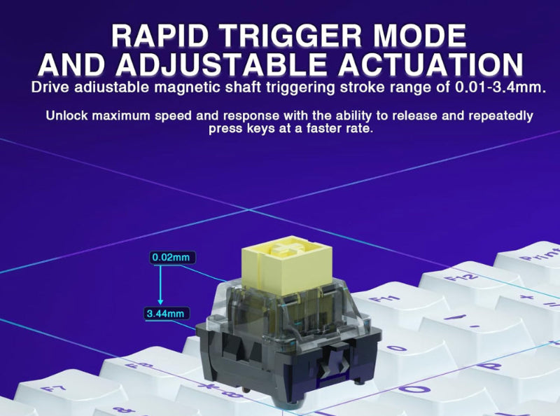 - Hall Effect Magnetic Switches: Utilizes non-contact magnetic switches for improved durability and a refined keystroke feel, allowing for 0.01mm to 3.4mm adjustable actuation points.